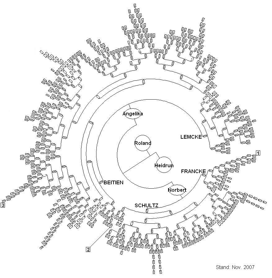 Die bis dato erforschten 1580 - 1645 Schäfer im Klostergut Schulpforta, ältester FRANCKE (12. Generation) [2] Heinrich Beitien 1750 - 1823 Schneider in Plügge auf Fehmarn, ältester BEITIEN (8. Generation) [3] Rauert Witte 1362 - 1437 kam aus Dithmarschen und lebte in Presen auf Fehmarn, ältester Vorfahre (22. Generation) |